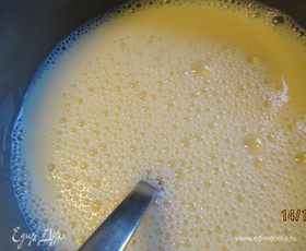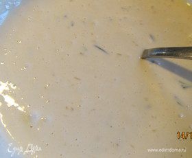 Делаем колодец в центре мучной смеси и добавляем жидкие ингредиенты и растопленное сливочное масло. Взбиваем венчиком до получения теста средней густоты. Отправляем его в холодильник, пока мы занимаемся остальными ингредиентами.