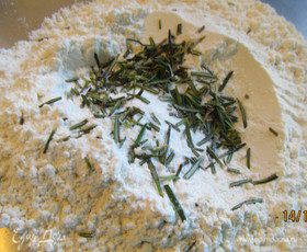 В большой миске смешиваем муку, разрыхлитель, рубленый розмарин и хорошую щепотку соли.