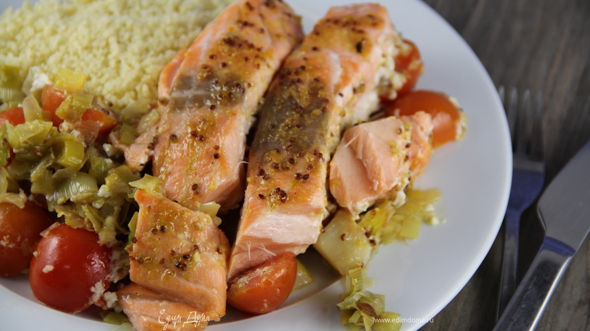 Лосось с луком-пореем