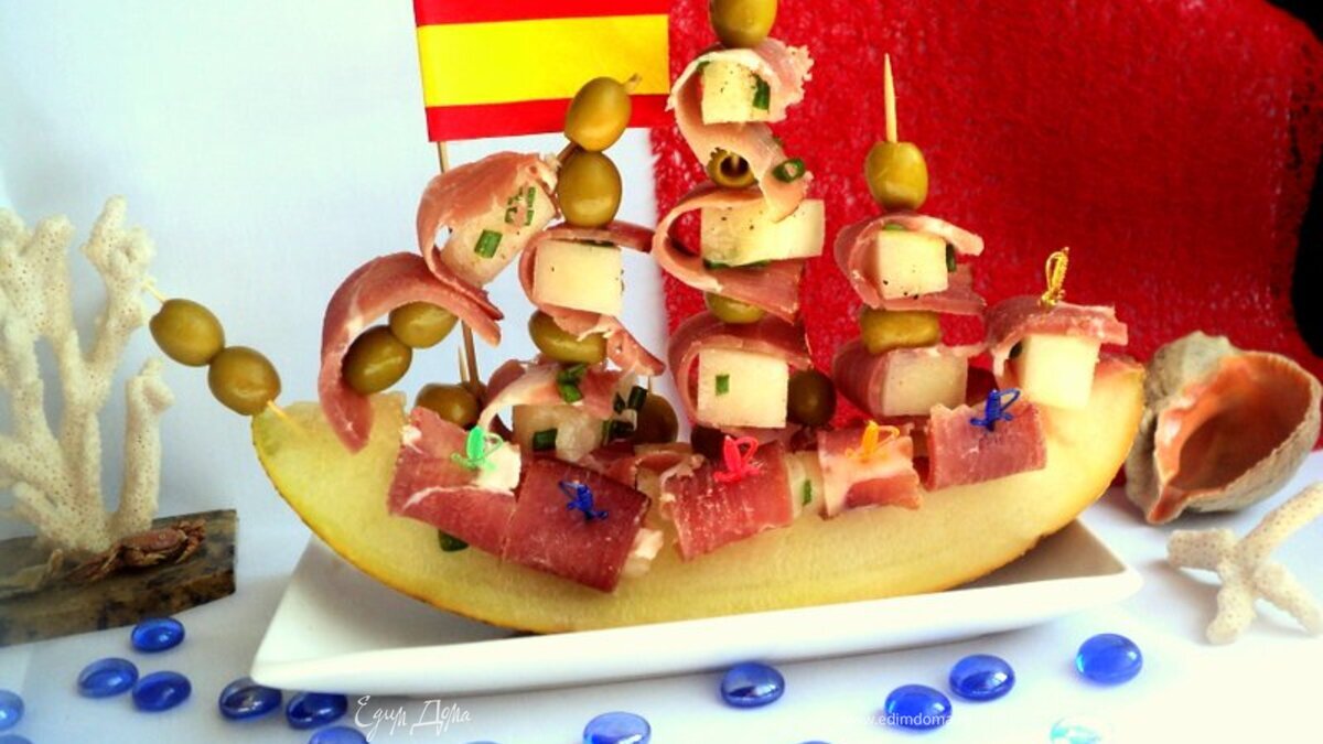 Хамон нарезать тонкими полосками. Обернуть кусочек дыни пластинкой хамона и закрепить шпажкой. Я оформила подачу закуски в виде парусника, дополнительно украсив блюдо оливками. Приятного аппетита!
