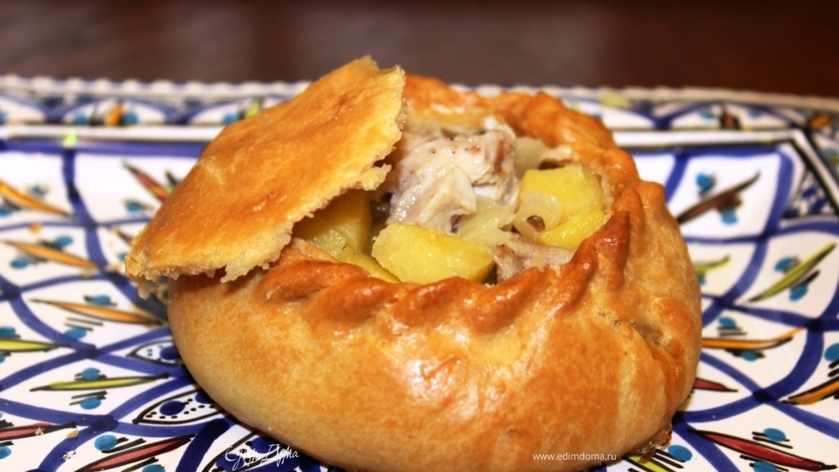 Маленький шарик теста тоже немного раскатать, уложить его поверх начинки. Края нижнего теста поднять вверх и залепить (соединить с верхним тестом). По окружности сделать красивые защипы. - Шаг 11