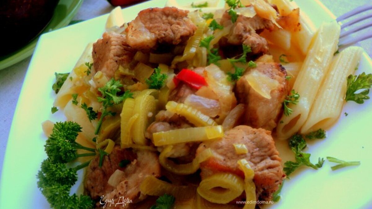 Лук порей порезать тонкими колечками.Через час после начала тушения добавить лук порей к жаркому и тушить до готовности. - Шаг 4