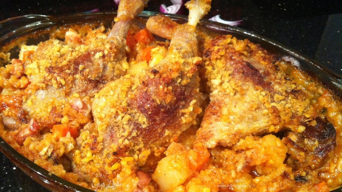 Повысьте температуру в духовке до 225 градусов. Распределите хлебные крошки поверх утиных ножек и овощей и оставьте в духовке на 15 минут... - Шаг 9
