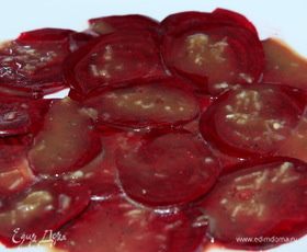 свёклу маленькую очищаем и нарезаем очень тонкими пластинками, выкладываем на плоское блюдо и каждый кружочек поливаем заправкой. Отставляем в сторону для маринования и переходим к соусу.