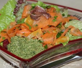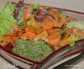 сверху выкладываем морковно-апельсиновую смесь с петрушкой и 1 анчоус, отдельно в салатнике выкладываем 1 чайную ложку соуса.
