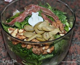 Этот салат я придумала для себя пару лет назад. Салат низкокалорийный, с двумя заправками. Но если хочется не очень низкокалорийный, можно добавить обжаренный бекон, или твердый сыр, или чипсы. В общем, на этой базе можно придумать много чего. Я, пробуя всякие соотношения продуктов, вывела для себя идеальный зеленый соус, как добавку. Вы сможете манипулировать продуктами и придумать свой вариант соуса. Количество салатных листьев дано с учетом для приготовления соуса, оливки - 4 крупных штуки.