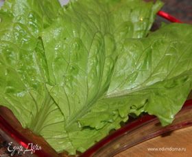 собираем наш салат. В порционный салатник выкладываем слоем листья салата