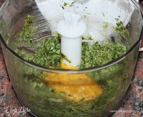для соуса листья салата, оливки, орехи, 2 столовые ложки оливкового масла, 4 анчоуса и половину пучка петрушки отправляем в блендер