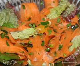 морковь нарезаем тоненькими пластинами, петрушку рубим, два колечка апельсина разбираем на кусочки, три-четыре салатных листа нарываем крупно и все смешиваем.