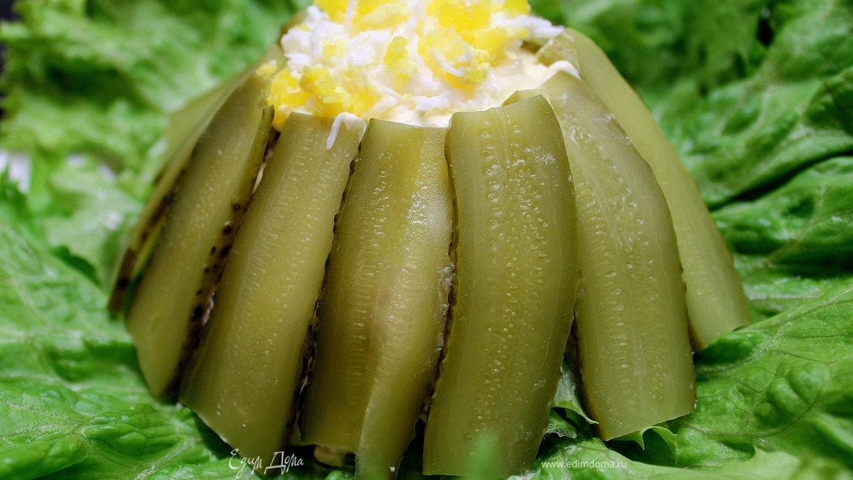 Салат оформляем нарезанными пластинками огурца, сверху кладем майонез и посыпаем натертым яйцом. Приятного аппетита!