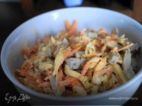 Если вы читали информацию обо мне, то знаете, что я учусь на первом курсе в колледже на технолога. Этот салат - моё первое домашнее задание по кулинарии, и делал я его по книге рецептур, так что все ингредиенты рассчитаны до грамма. Надеюсь, вам будет интересно понаблюдать со стороны за моей работой и вы оцените этот вкусный салат по достоинству.