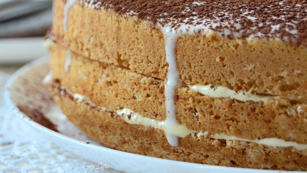 Собираем торт. Нижний и средний коржи пропитываем сиропом, затем все коржи смазываем лимонным кремом. Верхний корж можно присыпать какао.