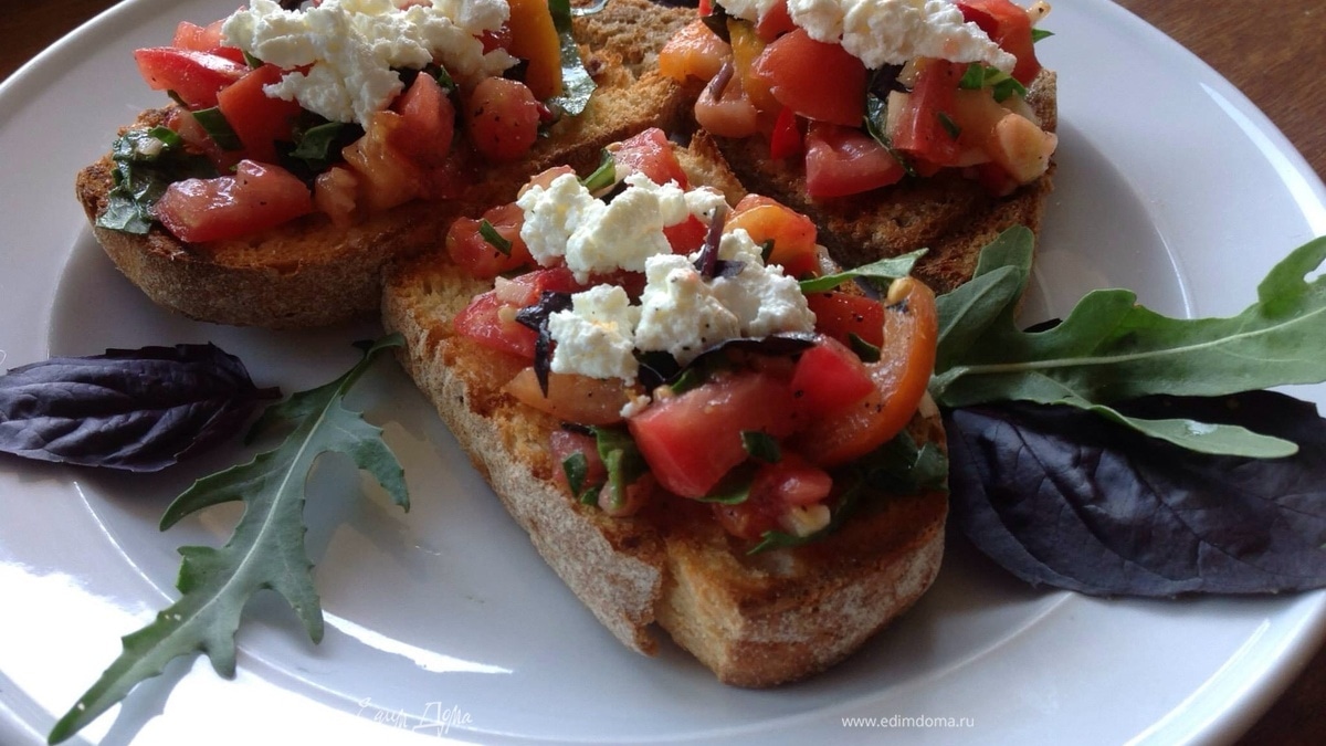 - Шаг 2Поджаренный багет с одной стороны натираем чесноком, сверху выкладываем наши помидоры и сыр фета ,сверху помидор, все это можно еще посыпать сухими итальянскими травками. Приятного аппетита :-)