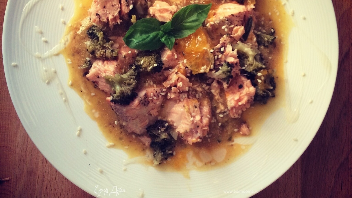 Через 5-7 минут готово! Сервируем суп. Выкладываем красиво кусочки рыбы, выжимаем сверху сгущенный температурой мандариновый сок, брокколи, листик базилика :) Та-дааааам.