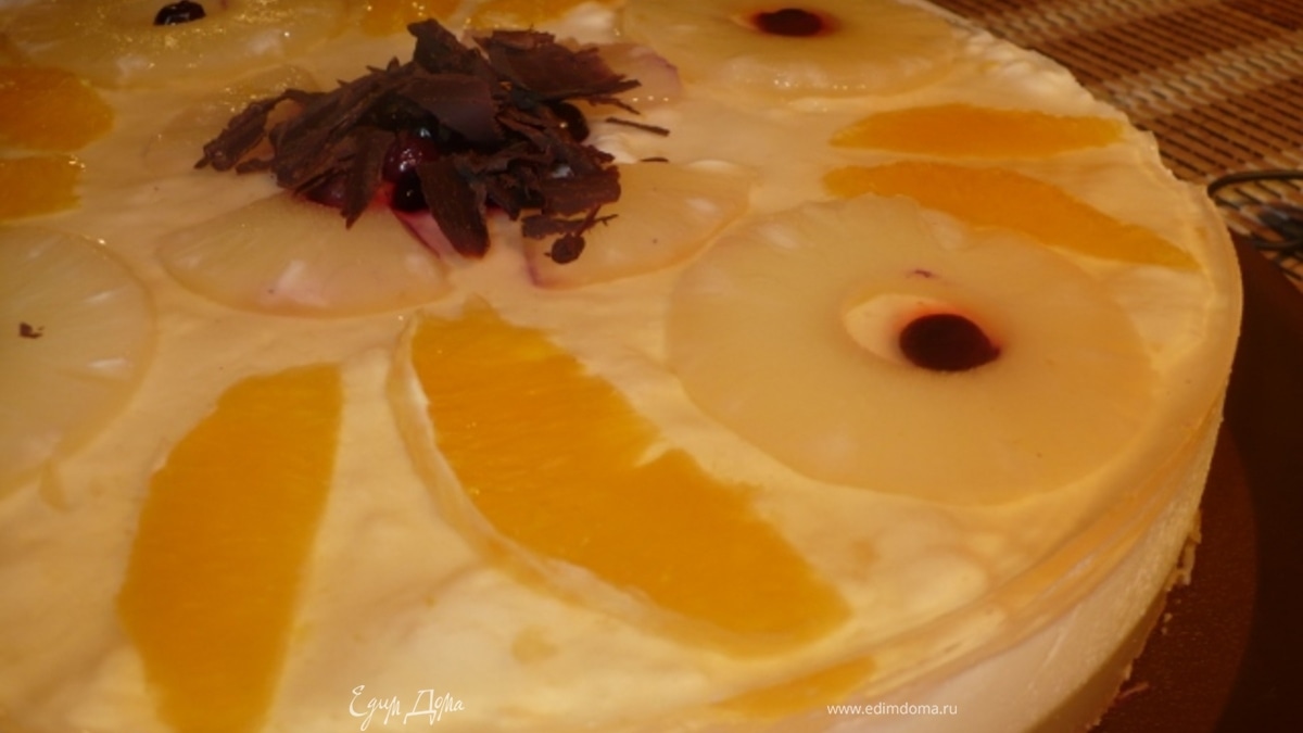 Заливаем фруктовым желе верх и ставим в холодильник для полного застывания всего торта. Потом снимаем кольцо и готово. Я делала 2 торта сразу, поэтому здесь фрукты немного по другому разложены, а принцип тот же.