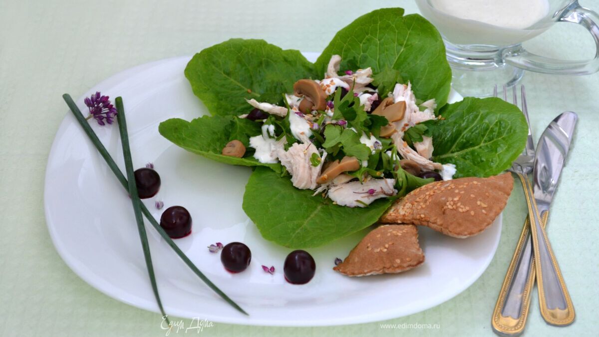 Салат с курицей и вишней под йогуртным соусом