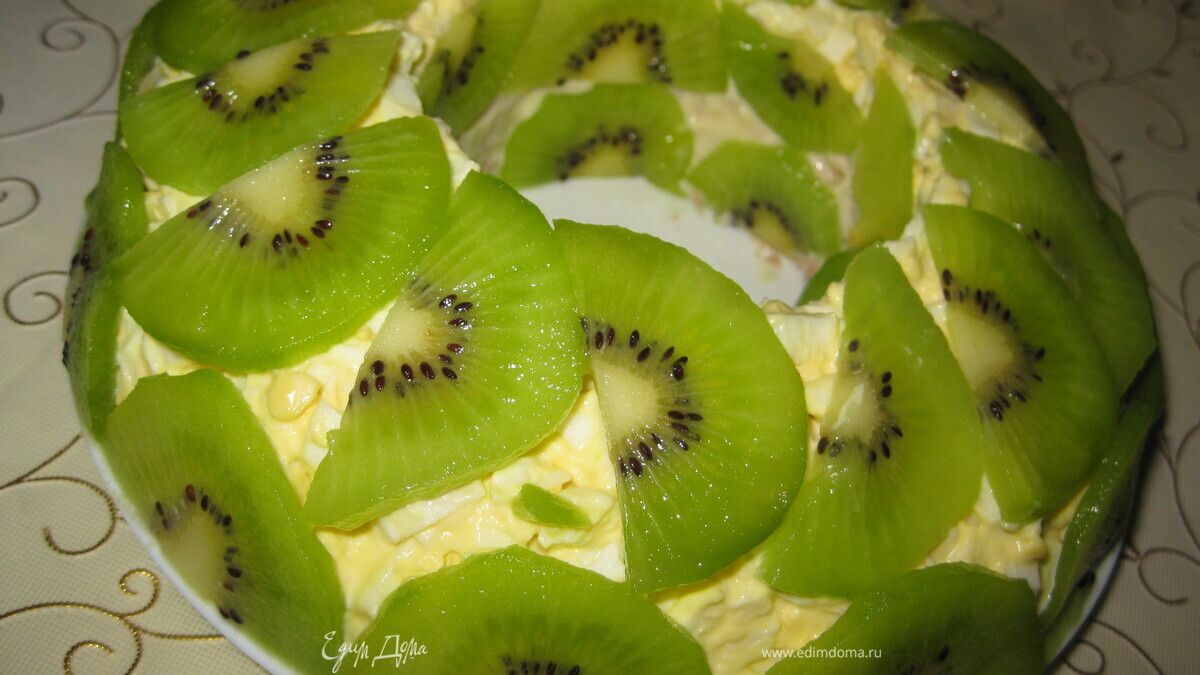 Вкусный и полезный салат с диетическим мясом кролика и витаминным киви ! Отлично смотриться на празднично столе.