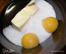 Отделяем желтки от белков. Взбиваем размягченное масло с сахаром и желтками в пышную массу. Я взбивала просто вилочкой. Если хурма не очень сладкая, то сахара рекомендую брать больше.