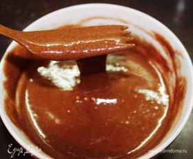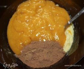 Мне захотелось дополнить картину шоколадным соусом из хурмы. Для него я измельчила мякоть одной небольшой хурмы в пюре и взбила ее вилочкой с порошком какао и сахарной пудрой. Количество сахарной пудры регулируйте по вкусу и консистенции. У меня ушло 5 полных столовых ложек. Можно заменить сахаром и прогреть всю массу на огне до его растворения.