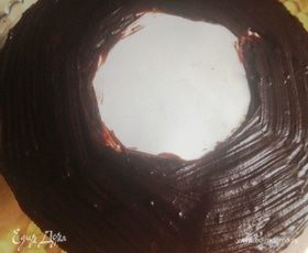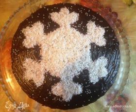 Достаем торт, смазываем серединку либо остатками глазури (тонким слоем), либо любым сиропом или медовой водичкой (разводим мед с водой 1:1), чтобы кокосовая стружка прилипла. И покрываем середину кокосовой стружкой теперь уж под "трафарет" из глазури. Если вы даже промахнетесь и насорите стружкой по глазури - ее можно будет смести кисточкой (для этого мы и ждали, чтобы глазурь застыла).