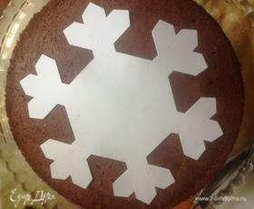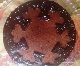 Приготовить глазурь: смешать все ингредиенты и, постоянно помешивая, довести до кипения. Сборка торта: более выпуклый корж (верхушка бисквита) поместить на блюдо, на него выложить весь крем, разровнять, сверху выложить 2-й корж (дно бисквита, чтобы был ровный). На него выкладываем трафарет (можно через поиск в интернете найти желаемую вами картинку, распечатать или просто обвести по экрану монитора и вырезать).