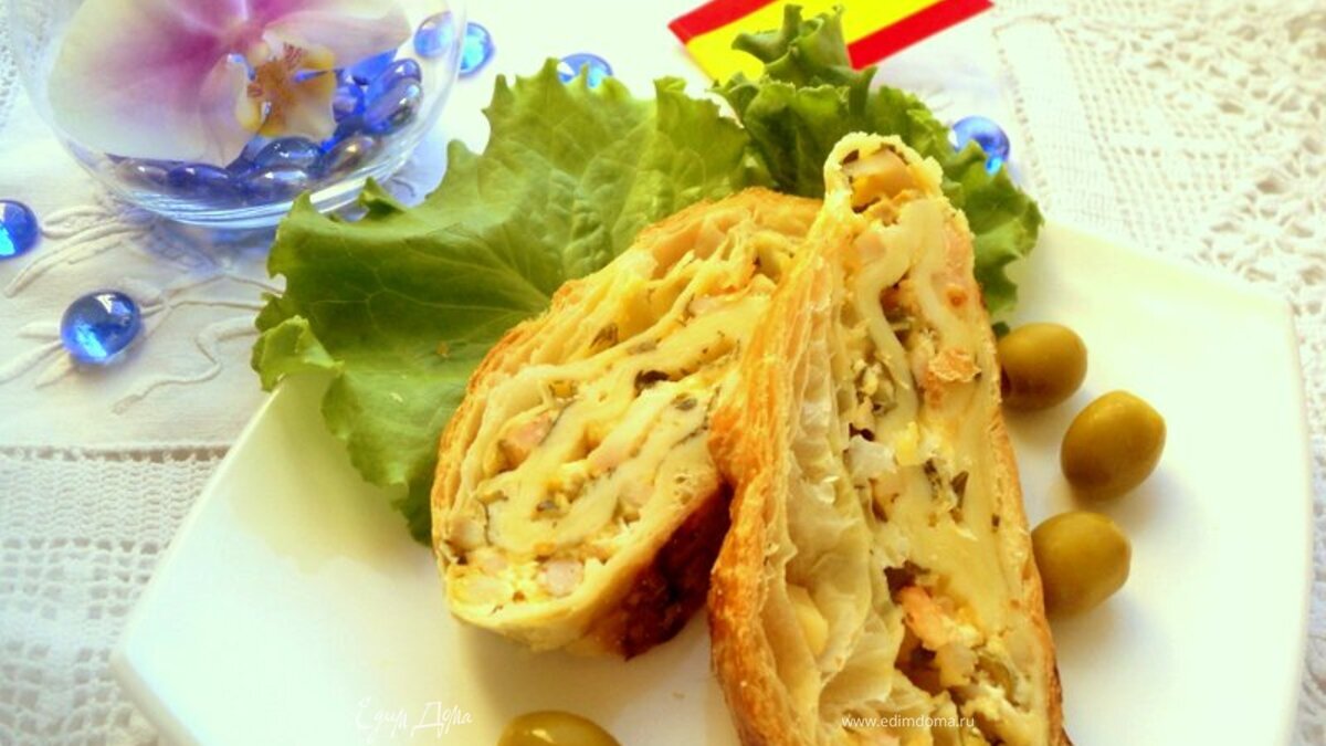 Предлагаю Вам приготовить пикантный рулет из слоеного теста с морепродуктами и оливками. Из морепродуктов я брала креветки и кальмары, но по желанию можно добавлять и другие морепродукты или взять морской коктейль.