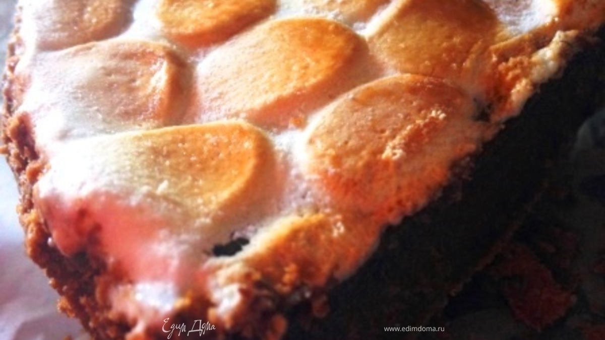 На готовый горячий пирог выложить разрезанные при помощи ножниц половинки маршмеллоу (жевательный зефир) и отправить на несколько минут в духовку под верхний гриль (следите, чтобы маршмеллоу лишь слегка подрумянились). - Шаг 6