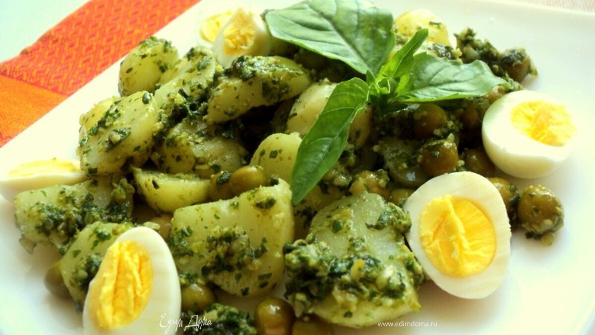 Картофель разрезать на половинки, добавить консервированный горошек и соус песто, перемешать. Посолить и поперчить по вкусу.