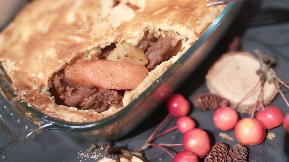 Предлагаю сегодня по-настоящему зимнее насыщенное вкусами и ароматами блюдо. Нежное, сочное мясо, слегка сладковатые, еще немного хрустящие овощи, неимоверно вкусный, наваристый соус и мягкое, но ломкое песочное тесто. Это блюдо не стыдно подать гостям, украсить им праздничный стол, ну или как мы: устроить себе неординарный воскресный обед. Очень рекомендую.