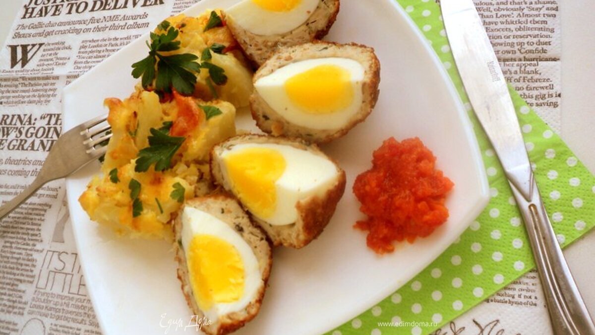 Отварить 6 яиц, 1 яйцо взбить вилкой. Если блюдо будет подаваться в горячем виде, то желательно яйца отварить всмятку. Формировать котлеты удобнее на пищевой пленке. Выложить фарш лепешкой диаметром 10 см. Яйцо обвалять в муке, смешанной с молотым перцем, положить на лепешку из фарша. Обжать фарш вокруг яйца, поднимая края пищевой пленки. - Шаг 3