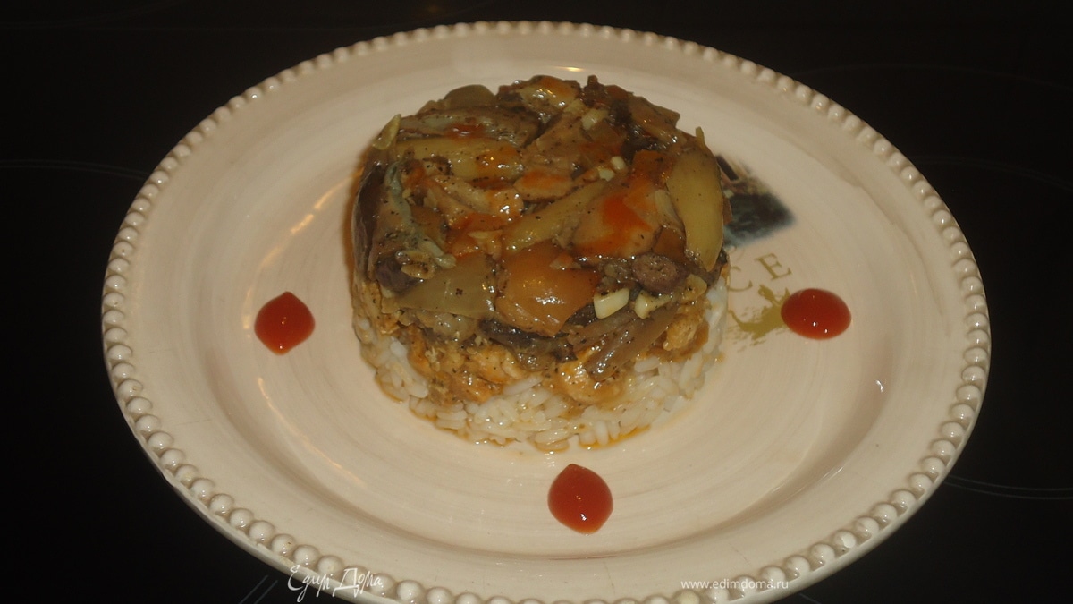 - Шаг 4Собираем блюдо в круглую форму. Слой грибов, потом слой курицы, потом слой риса, и аккуратно выкладываем на середину тарелки. Украсить томатным соусом или на свой вкус.