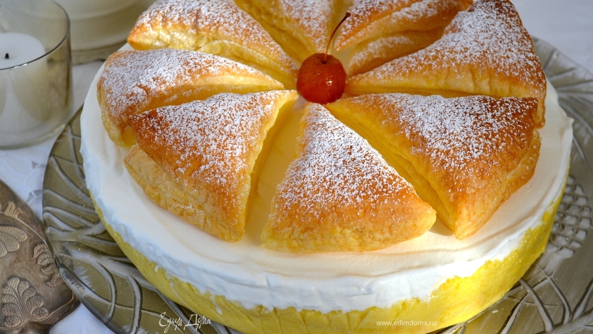 Готовый торт украсить треугольничками из слоеного теста... Проведя по краю формы теплым сухим ножом, аккуратно извлечь торт из формы! - Шаг 14