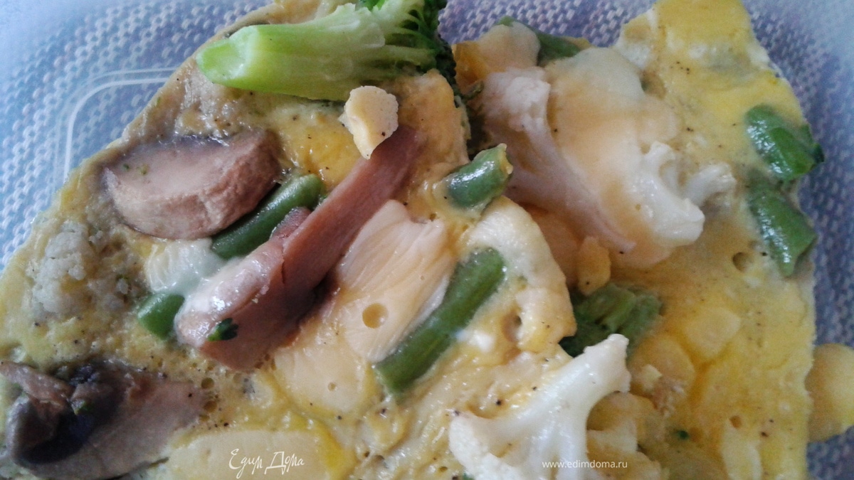 Часто готовлю такой вариант быстрого обеда. Добавки всегда разные, что есть в холодильнике. Сегодня вариант с грибами, цветной капустой, брокколи и стручковой фасолью! Недавно узнала, что такой вариант омлета - это фриттата так сказать! Ну так, значит так