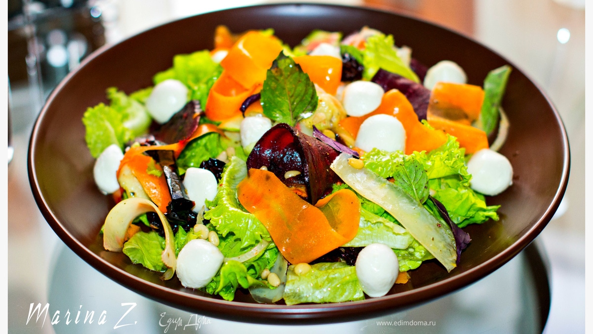 Добавить моцареллу. Полить заправкой, аккуратно размешать. Посыпать кедровыми орешками. Приятного аппетита!