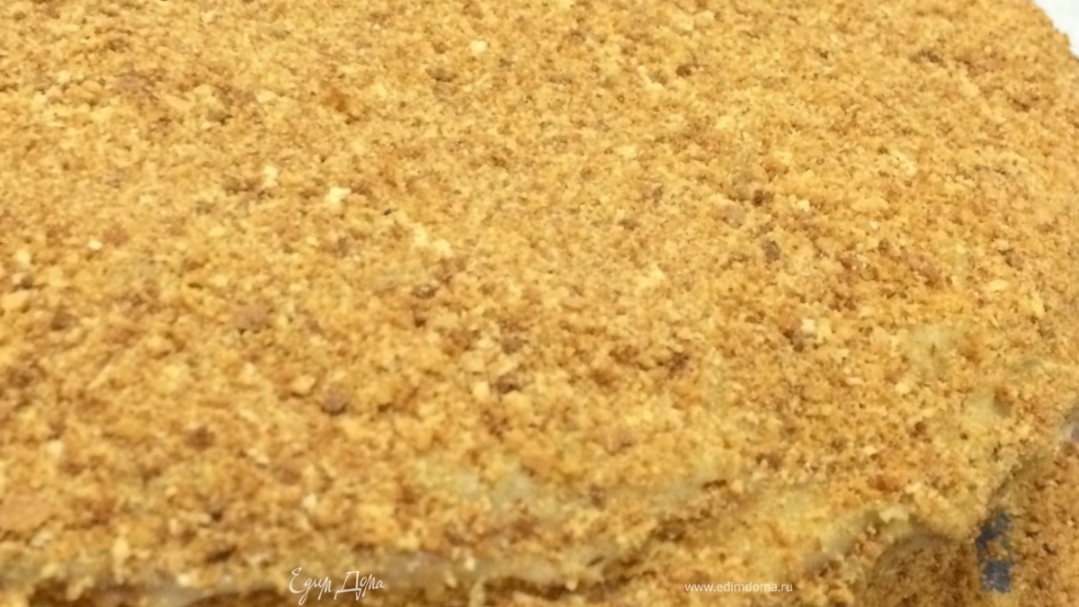 Из обрезков сделать обсыпку, для этого измельчить их скалкой. Смазать коржи кремом, примерно 3–4 ст. л. крема на каждый корж. - Шаг 6Последний корж тоже смазать кремом и обсыпать сверху измельченными обрезками. Убрать торт в холодильник на 3 часа. Приятного аппетита!