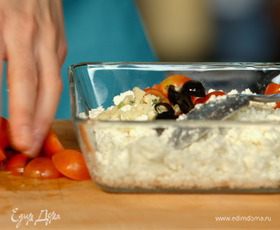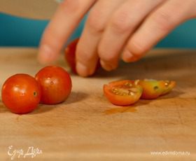 Помидоры черри и маслины без косточек нарезать кружочками.