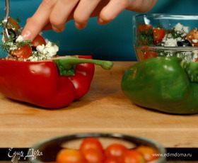 Перцы уложить в форму для запекания, сбрызнуть оливковым маслом, первые 20 минут запекать под фольгой при температуре 220 С. Потом фольгу снять и запекать ещё 10 минут до полной готовности.