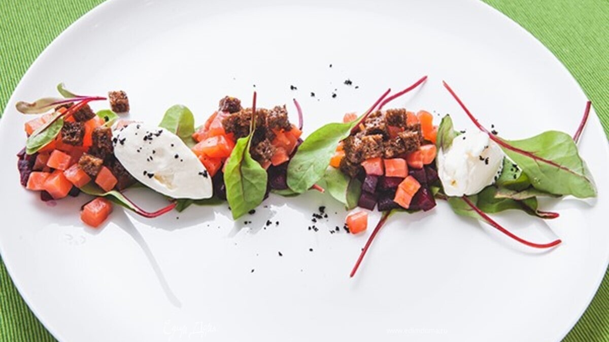 - Шаг 4На тарелку выложить салат, тар-тар из лосося, свеклу и гренки. При помощи двух столовых ложек сформировать кнедли из заварного крема и дополнить ими салат.