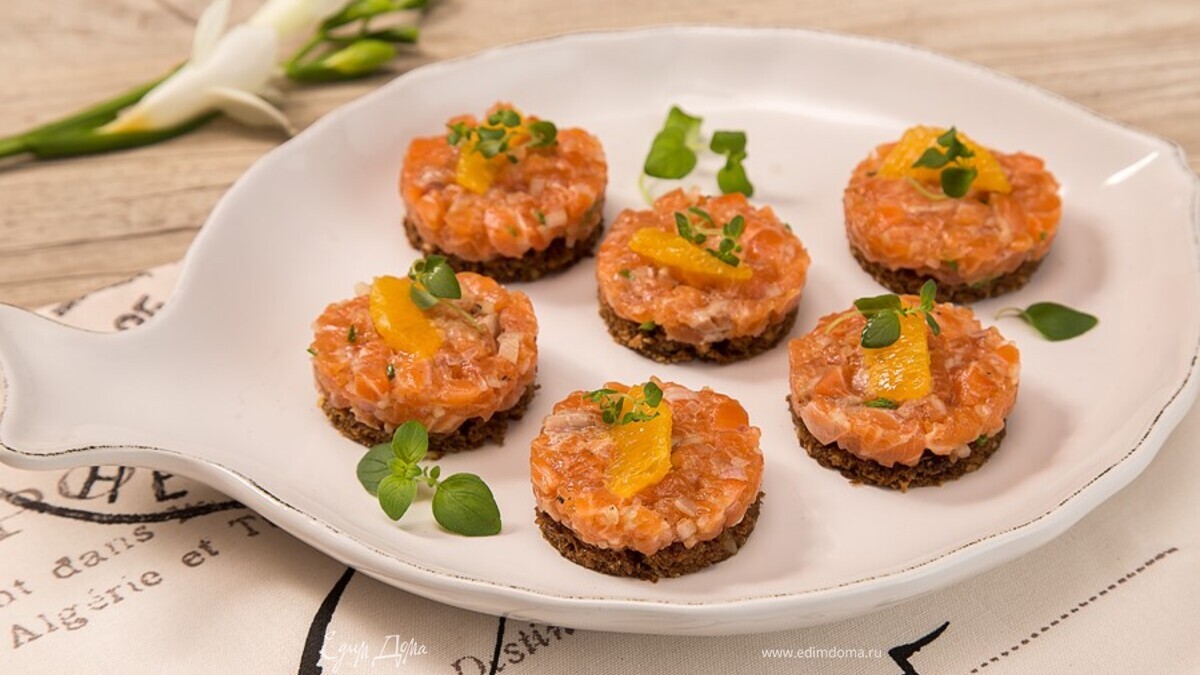 - Шаг 4Вложить в кольцо хлебную основу, сверху выложить по 1 ст.л. тартара и слегка утрамбовать.