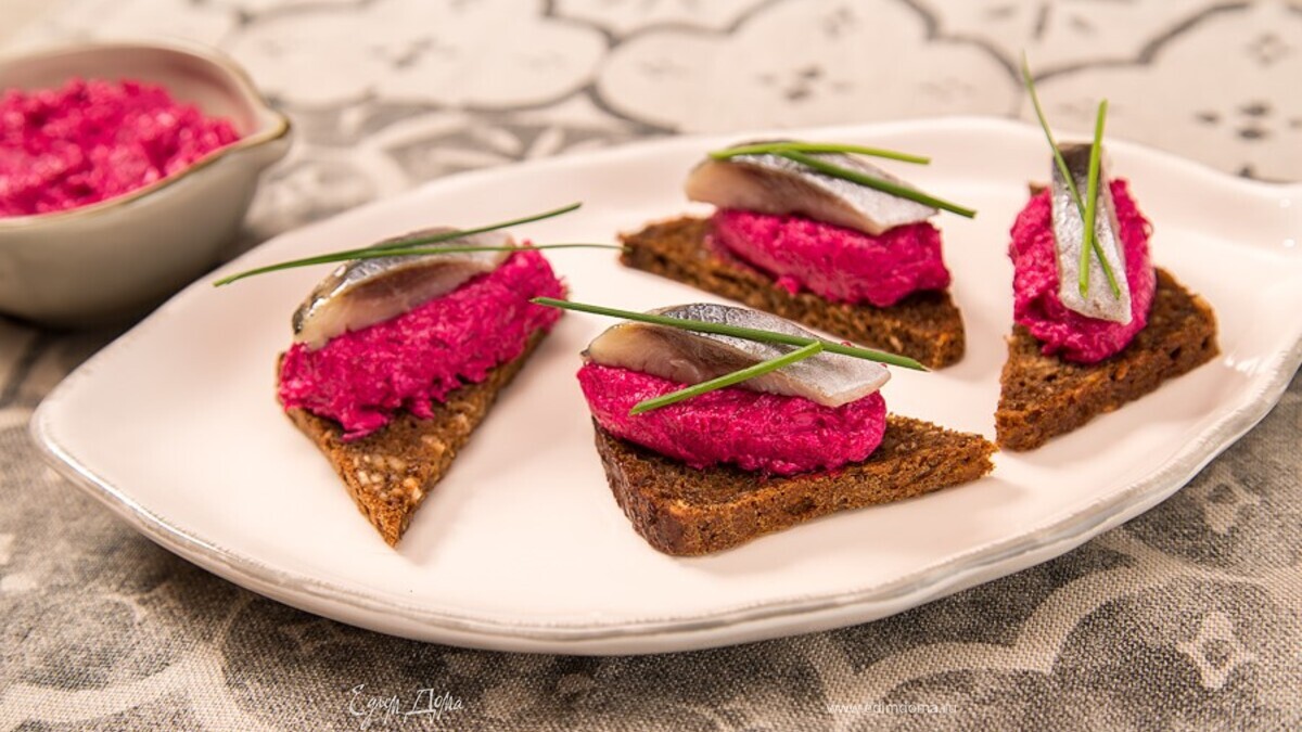 - Шаг 4На каждый ломтик хлеба выложить по 1 ч. л. свекольного мусса, сверху небольшой ломтик сельди, украсить зеленью.