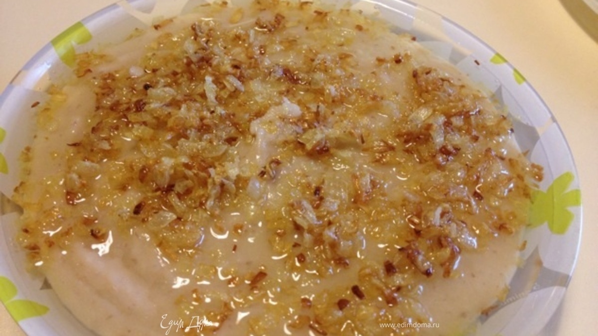 Лук порезать как любите (полукольцами или же мелко), пожарить на растительным масле. Затем вылить все на пюре. Если масла кажется многовато, лишним в итоге оно не будет. :))) С этой порции получается 2 блюда.