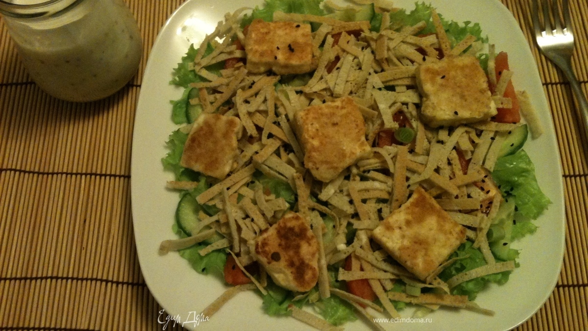 Поверх овощей выкладываем кусочки сыра и лапшу из яйца, посыпаем кунжутом и мелко нарезанным зеленым луком. Немного солим. - Шаг 5