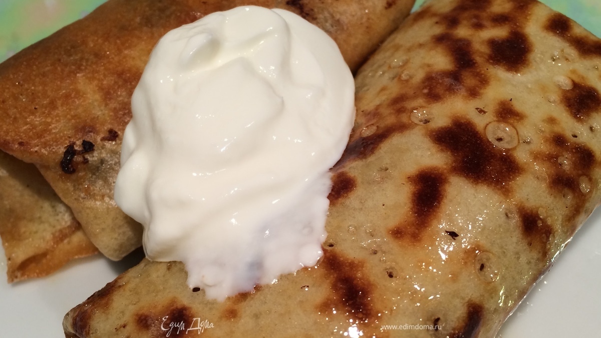В каждый блинчик заверните начинку и сложите конвертиком. Обжарьте блинчики с мясом с обеих сторон на сливочном масле по 2 минуты. Подавайте со сметаной. Приятного аппетита!