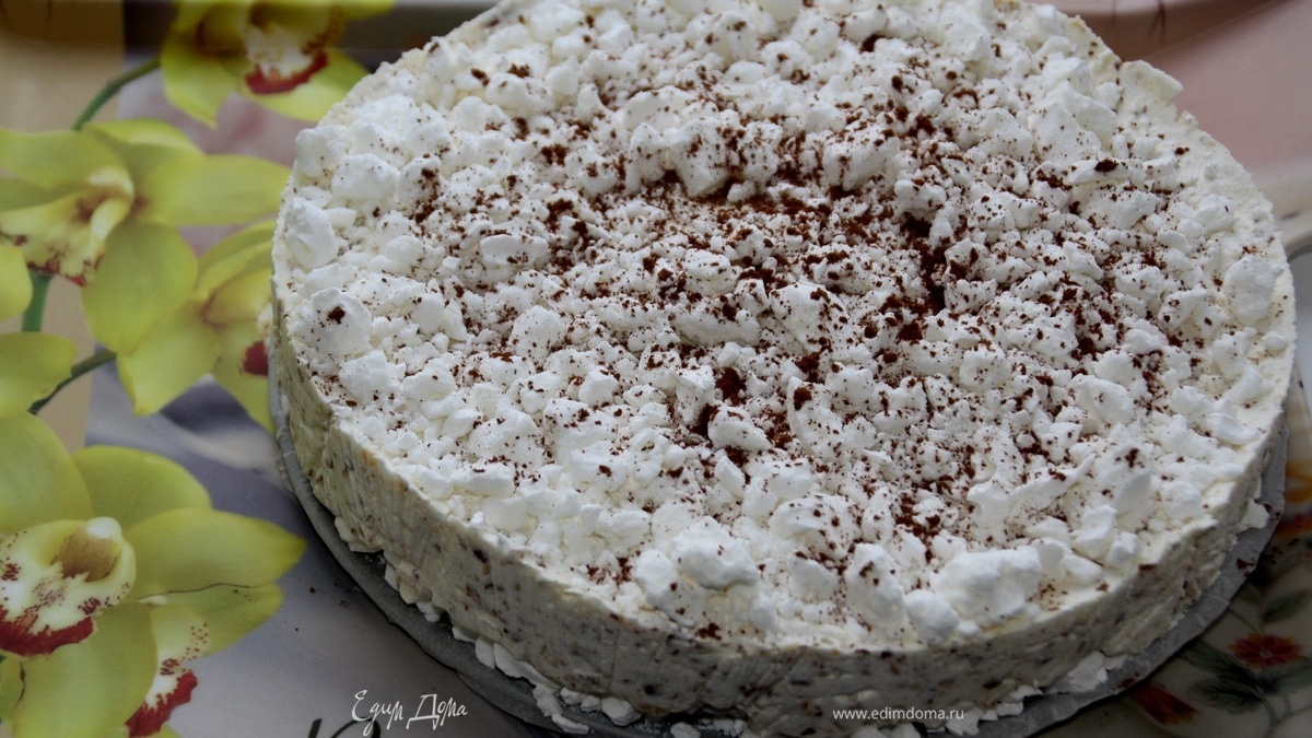 Выкладываем сливочно-белковую массу в форму и разравниваем.Верх покрываем оставшимися крошками безе. Отправляем замораживаться на 8-10 часов. Десерт перед подачей следует выдержать минут 10 при комнатной температуре, но он не застывает совсем, напоминает мороженое, а потом, немного постояв, превращается в нежнейшее "облачко";-)По желанию посыпаем верх десерта какао... - Шаг 4