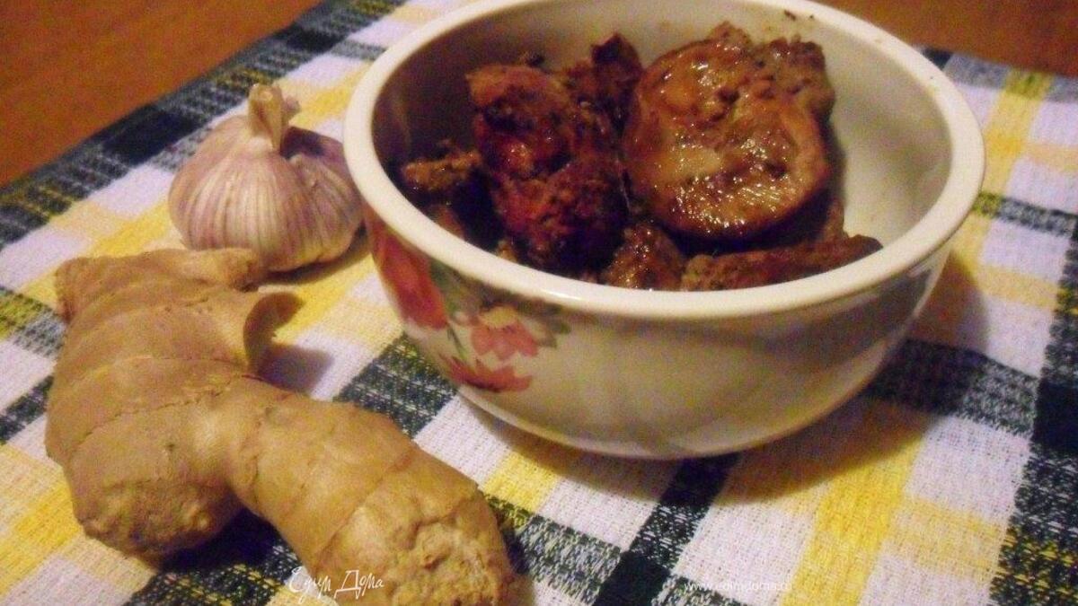 Во многих кухнях мира есть рецепты похожие рецепты. В то же время рецепт до безобразия прост. Получается пряная, ароматная, нежная печень. Важно не пересушить печень и одновременно дожарить. Кстатти, печень снятая с огня "доготавливает" себя. Имбиря надо взять примерно 2 см. Рецепт из книги гастронома "Золотая коллекция рецептов"