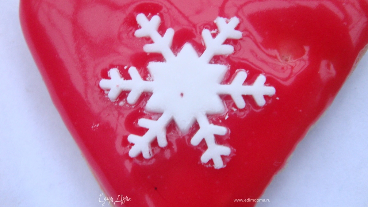 Я начала с простого. У меня есть вырубки в форме снежинок трех разных диаметров. Они идеально создают предпраздничное настроение и являются самым красивым украшением печенья! Я просто раскатала в 2 мм пласт подкрашенной в красный цвет мастики и на густой сироп приклеила снежинку! - Шаг 6