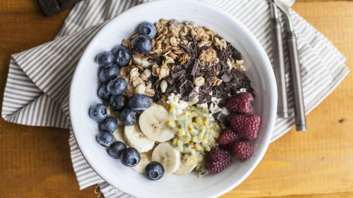 - ПодготовкаТворог смешиваем со сметаной. Выкладываем на тарелку, добавляем гранолу, банан и ягоды. Отличный завтрак готов!