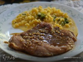 ....грибами, луком, колбаской и шпинатом в сливочном соусе под сыром запеченные в духовке + молодой картофель, тоже запеченный).