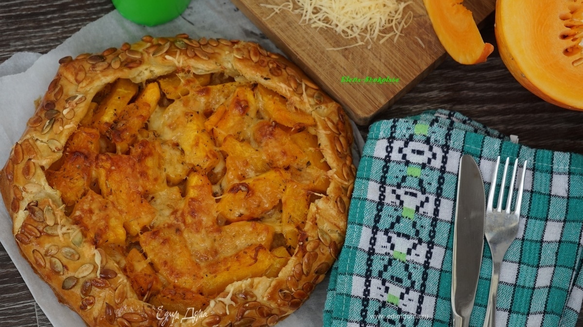 Сыр (у меня эмменталь) натереть на мелкой или средней терке (можно грюер, ярлсберг). Достаем тесто из холодильника. Перекладываем его на противень. Собираем галету. В центр галеты слоями выкладываем начинку: натертый сыр, затем лук, сверху тыкву, оставляя свободными края теста по 5 см. - Шаг 9
