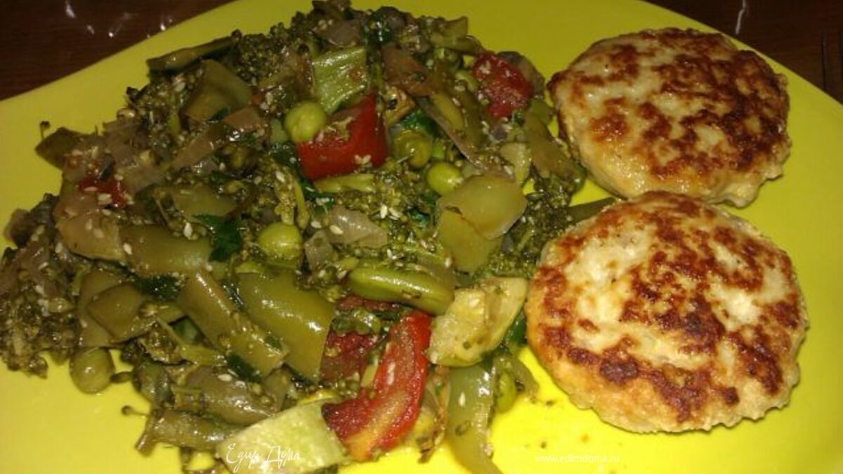 Овощной микс с кунжутом и соевым соусом и куриные котлеты.